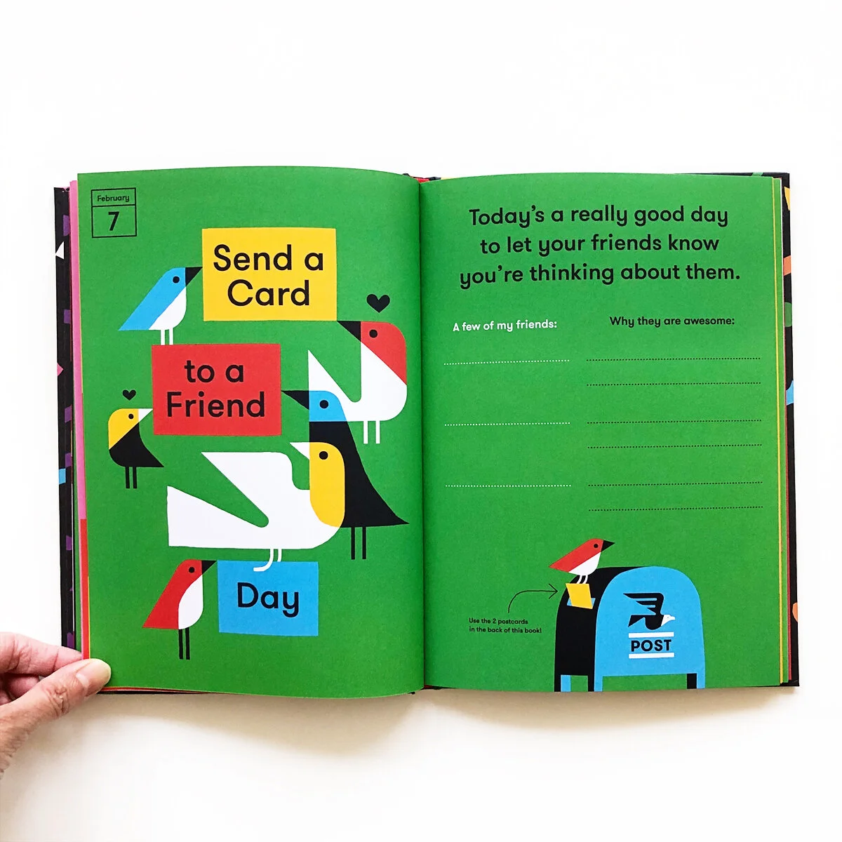 The latest book from Wee Society celebrates special days of the year, whether they be fun, funny or both — Static Electricity Day, National Backwards Day, Measure Your Feet Day, National Popcorn Day, Hug Your Cat Day, Morse Code Day and more. Included are creative ideas that will make them memorable and a place to record the magical and quirky ways you’ve celebrated the year as a family. Amongst the many surprises in the book are a perpetual calendar marked with 130 holidays inside the dust jacket and postcards for Send a Card to a Friend Day. A fantastic book for the small and big celebratory moments of life. It’ll be out on Tuesday, November 5.